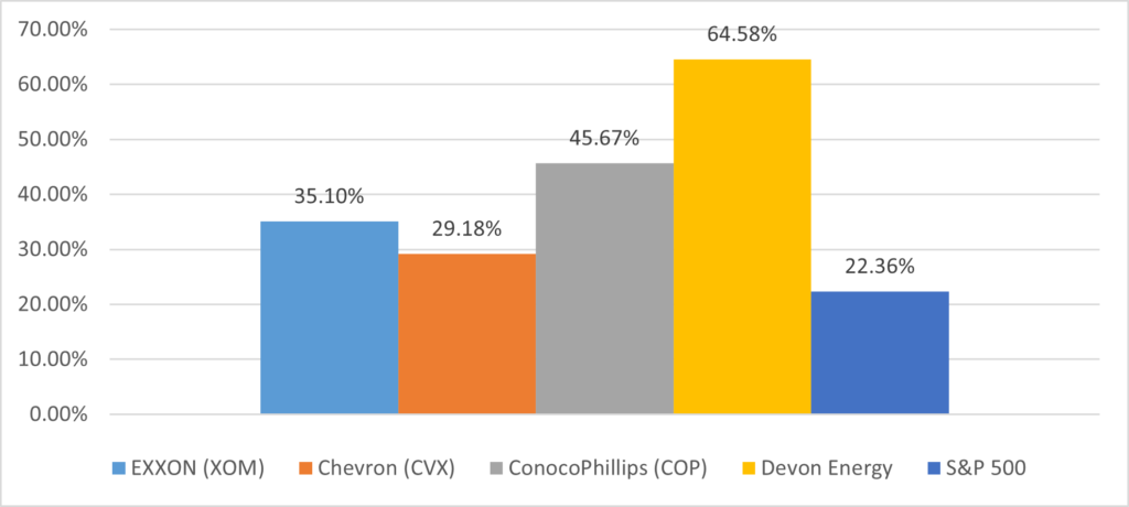 The energy sector ended 2021 as the top performing market sector, up over 55%. The second and third quarter slumps in oil stocks did not deter fourth quarter traders since the political games and international pressures created an environment where it will be difficult for the price of oil to maintain any significant drop. This is largely due to the fact that the Biden Administration has maintained its anti-oil stance, even in the face of economic and political pressures. The President has continued to limit US oil production while still petitioning Russia, OPEC, and other middle eastern countries to increase production. Even without any conflict overseas, the supply demand ratio still only points to further increases in oil and gas prices as was the case at the end of the third quarter. As of December 31st, the price of Brent Crude was still hovering around $80 per barrel. The decreased production that drastically helped the largest oil companies has now fully trickled down to American citizens, with gas prices around the nation up over 58% since December of 2020. This works out to an average price per gallon of $3.50 across the country. Here is the performance of 5 top oil industry leaders compared to the S&P 500 in 2021: