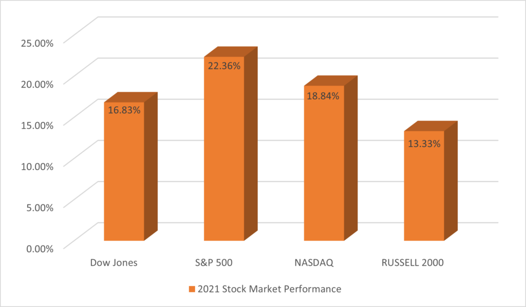 The fourth quarter of 2021 ended in gains for the financial markets. All eleven market sectors ended up, which is a rare occurrence. All four major indexes in the US stock market were up as well; however, the Russell 2000 small cap index was the worst performer for the quarter, only gaining 0.16%. In a strange turn of events, the S&P 500 outperformed both the Dow Jones and the NASDAQ. This has not happened in some time and can be attributed to the major gains in a few of the S&P 500’s names (i.e. Moderna, Nvidia, Ford Motor Co., Devon Energy Corp., etc.) The radical changes, both socially and economically, in US federal policy continued but were starting to be mitigated by December. This is especially due to the split US Senate. The market indexes (Dow Jones, S&P 500, NASDAQ, & Russell 2000) ended 2021 as follows¹: